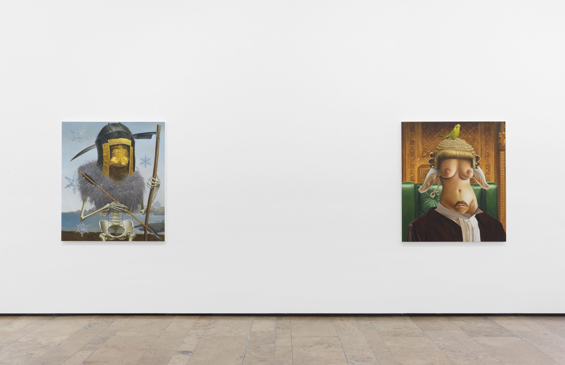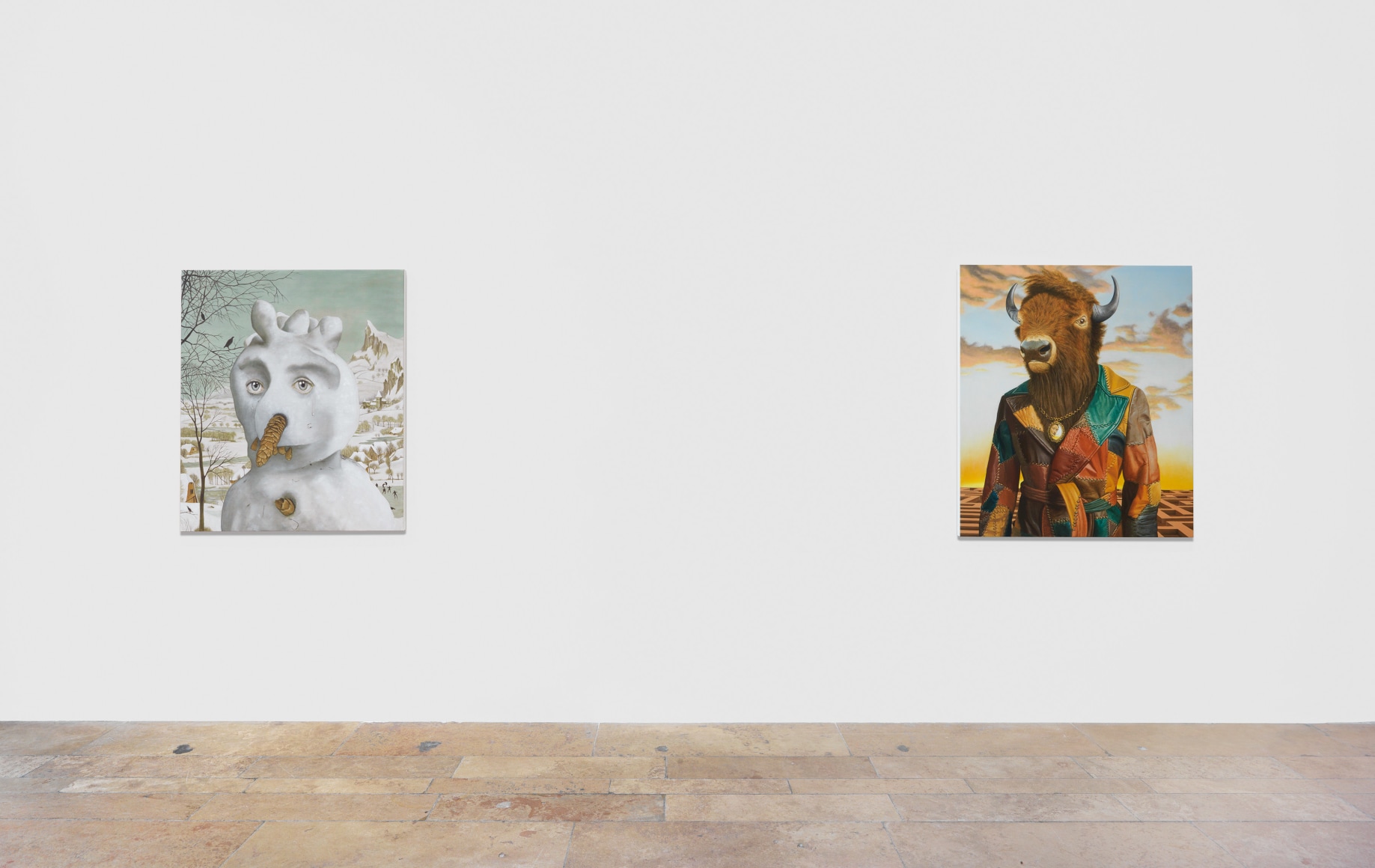 Opposing forces of artistic longevity and potential ephemerality are examined via a solitary skeleton standing on desolate ancestral land (Death in Ireland), and a melting snowman in an idyllic Brueghel scene (Snowman in Brueghel). Each painting uniquely articulates the experience of life as an artist and what it means to make something that will last beyond the lifetime of its maker.