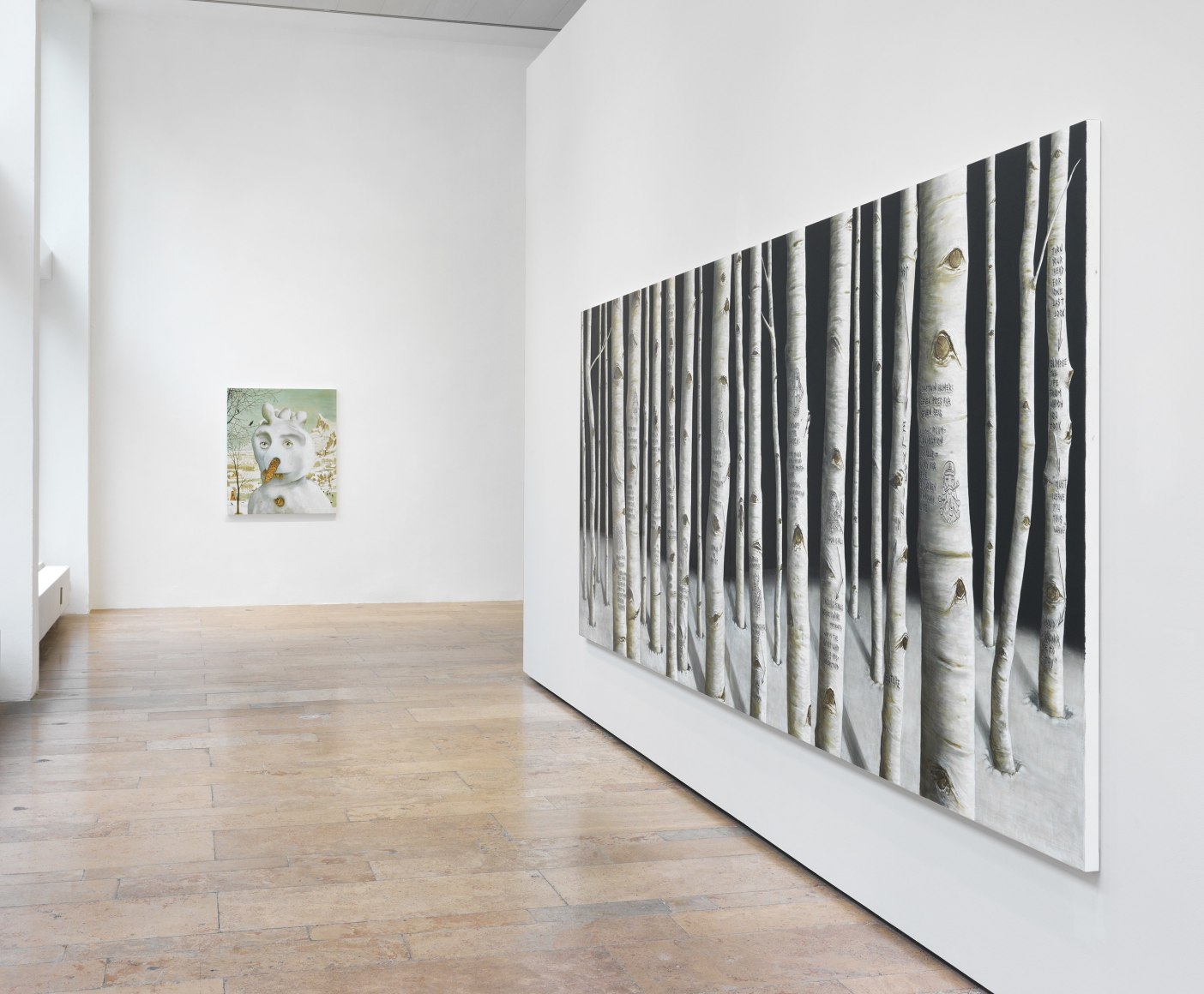 Binding these Small Brass Raffle Drum paintings together is Elysium, a painting of a dense snowy aspen tree forest illuminated under the night sky. Arborglyphs—words and images inscribed onto the tree trunks—reference each painting and, by default, weave in threads of Landers' past work. Formally, these paintings are the descendants of Landers' early "black on white" text paintings from 1993. Just as each aspen tree forest spreads from one ancient unified underground root system derived from a single seedling, so too does an artists' oeuvre represent a unified and intertwined system of ideas and images. Essential to the longevity of the work is the deep- grounded connection between all works in an artist's oeuvre, bridging the past with the present throughout a lifetime of making art. As Elysium is the mythological place where favored heroes are conveyed by the gods after death, so too will future generations favor paintings sent from artists in the past.